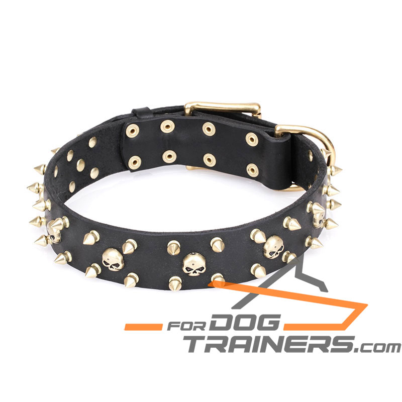 Brass plated steel adornments with golden-like shining are very attractive. They are made of strong, dog-safe and friendly metal, which is resistant to rust and corrosion. Each decorative item is secured with a rivet to eliminate the possibility of being lost. This leather dog collar is fancy decorated with spikes and skulls evenly arranged along the product. This functional accessory is made for daily walking, basic training and showing off your pet. Full grain genuine leather is soft and safe for your dog. Reliable traditional buckle and D-ring are also made of brass plated steel to serve your canine for years.