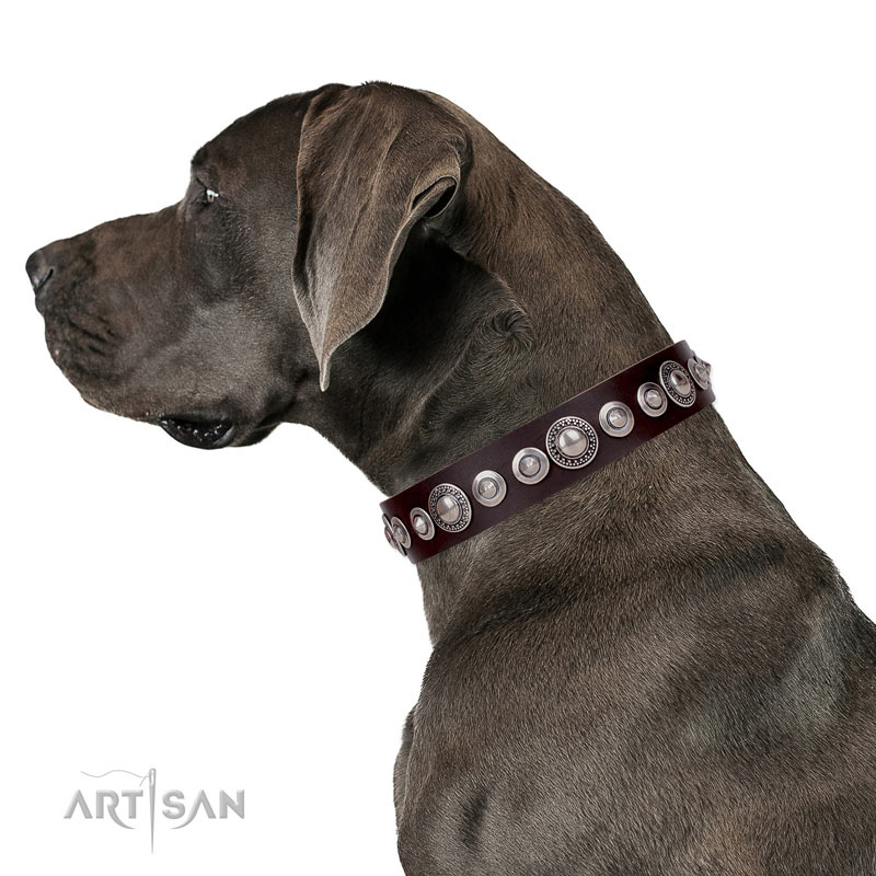 Great Dane adorned full grain natural leather dog collar with embellishments