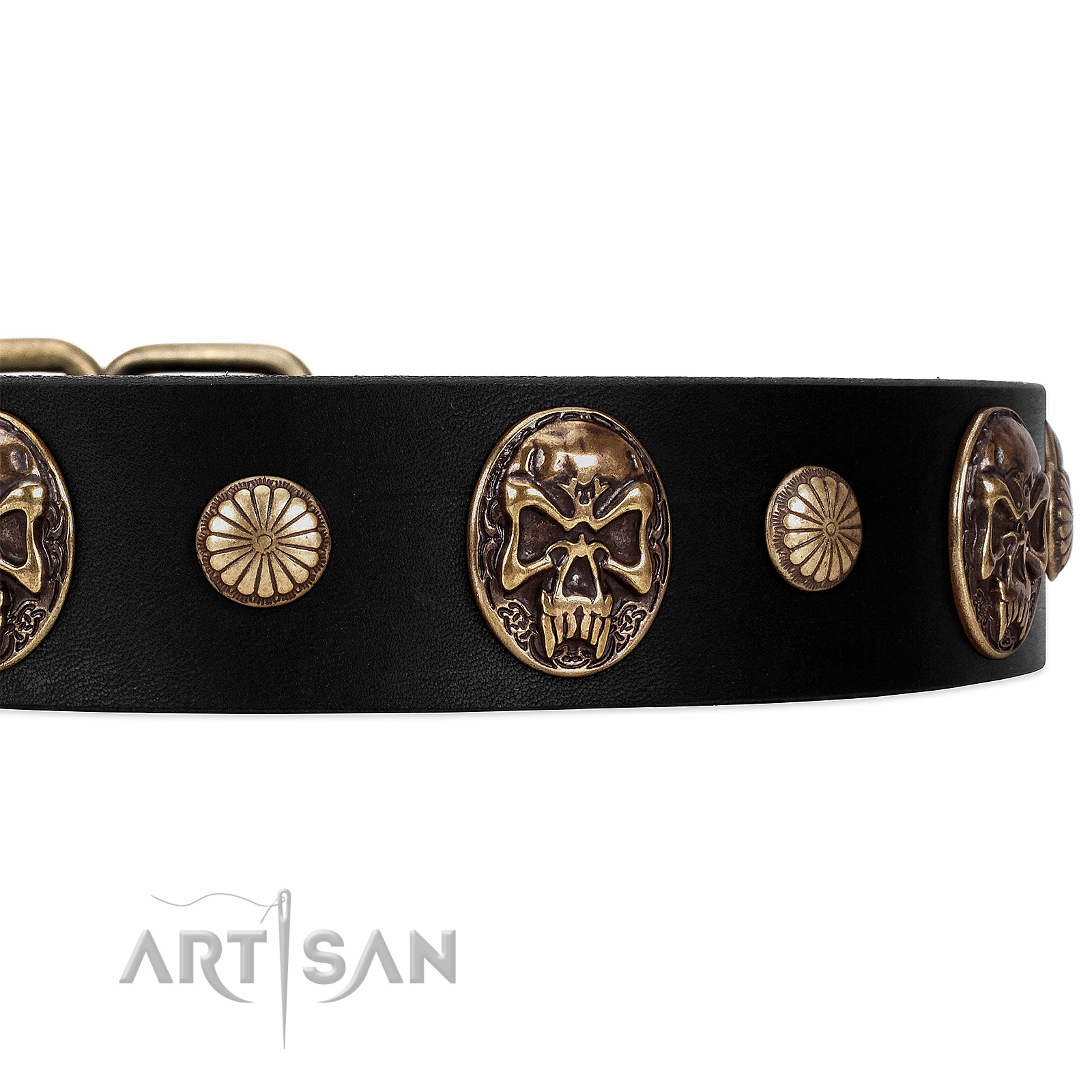 The collar is a true treasure for those who like stylish and extraordinary things. Large medallions are arranged in a row with tiny studs set in between them. Each piece is secured with high-quality brass rivets. The decorations look amazing as they have gold-like color. Due to crafty skulls on the medallions, the collar adds strictness and extraordinary style to your dog's look.