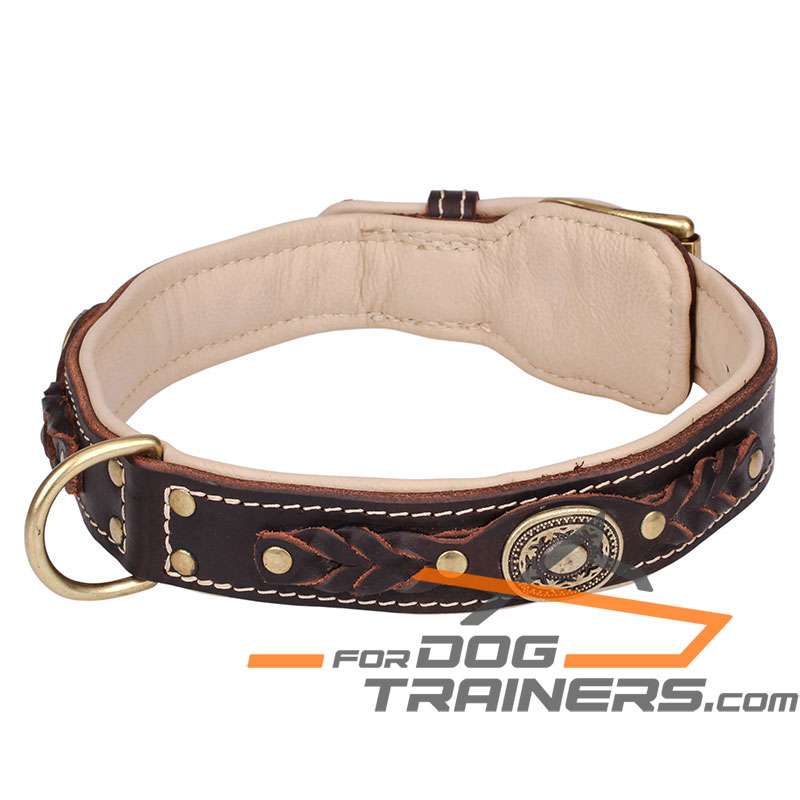 Wanna make your pet the cutest around? Let your dog stand out sharply against the other pets around! You can obtain this Royal Padded Leather Collar with the snap of your fingers. The accessory is of unique design and exquisite look that will equally suit daily walking and even basic training. There are brass decorations on the leather strap and exquisite braids for more fashionable look.
