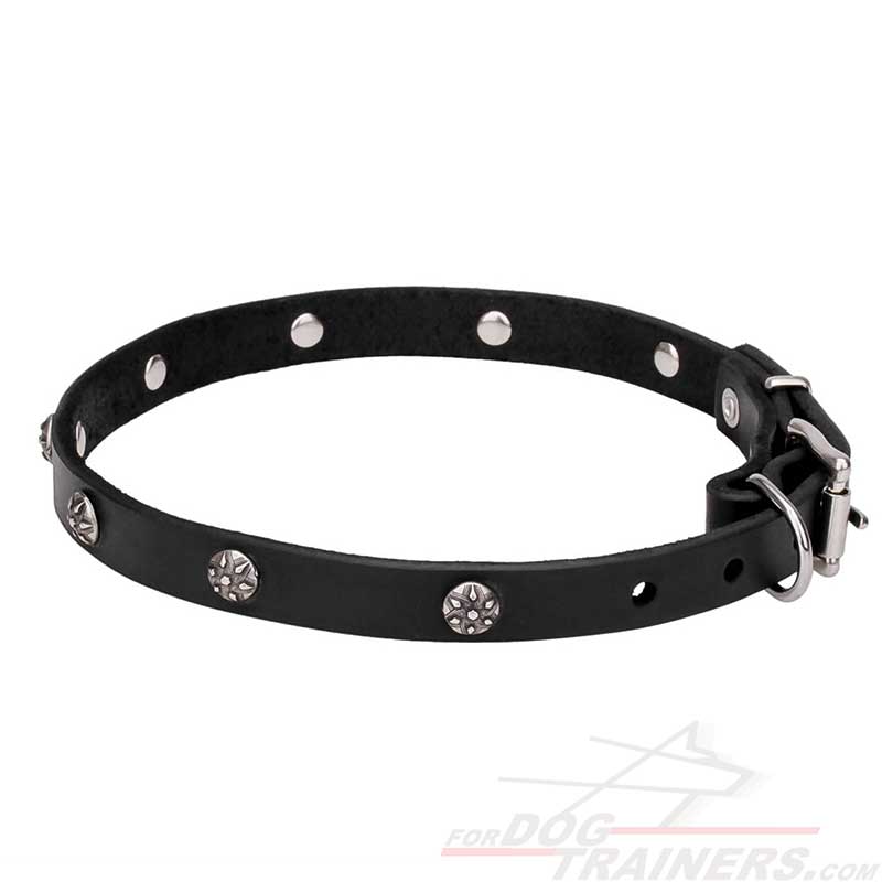 Leather Dog Collar with Silver-Like Chrome Plated Decorations